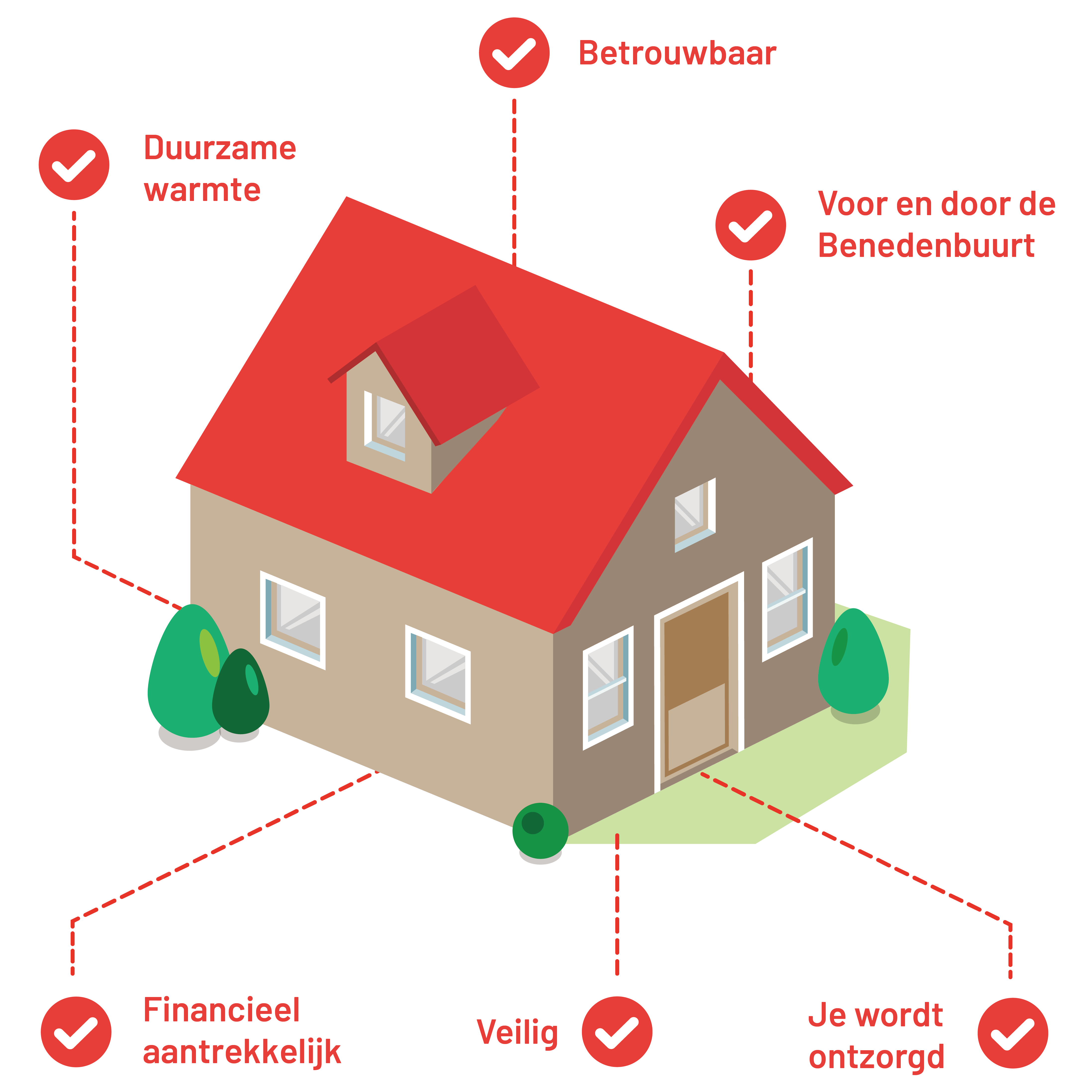 In één keer over op duurzame warmte, zonder dat je er zelf iets voor hoeft uit te zoeken. Voor jou als bewoner van de Benedenbuurt ligt er een uniek en zorgvuldig uitgedacht aanbod klaar. 90% van de woningen wordt aangesloten op het net.