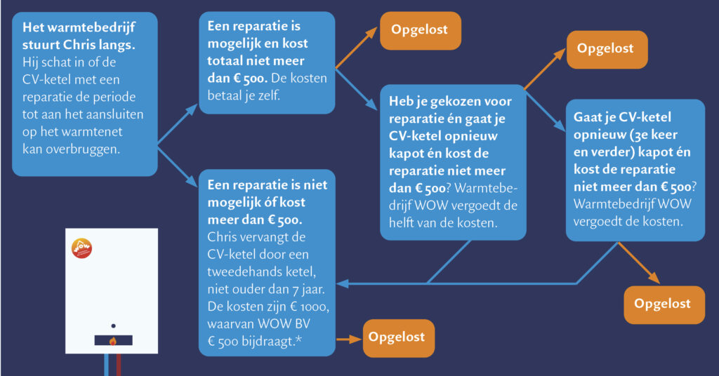 Vanuit het warmtebedrijf helpen we je graag zo goed mogelijk. Daarom hebben we een aanbod voor je gemaakt waardoor repareren aantrekkelijk is. We werken samen met installateur Chris Oosterhof (www.convecta.nl) die ook in de Benedenbuurt woont. Je kunt natuurlijk ook gewoon je eigen installateur vragen om naar de cv-ketel te kijken. Onze tip: laat je installateur weten dat de buurt over twee jaar van het aardgas af gaat. Zo kan hij beter beoordelen of een reparatie wel of niet aantrekkelijk voor je is.